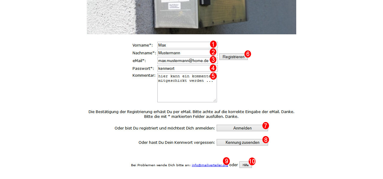 Um die Verteilerseite nutzen zu können, mußt Du Dich zuvor registrieren. Diese Seite sieht wie folgt aus. Die Seite wird ebenfalls
