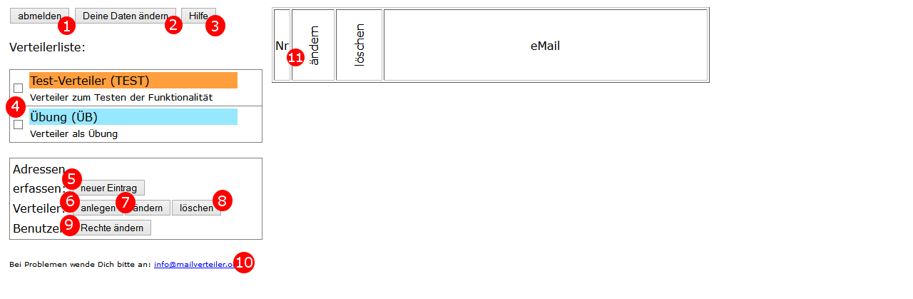 - Im linken Bereich werden alle Verteiler aufgelistet, auf die Du Zugriff hast. Jeder Verteiler wird über einen kurzen Beschreibungstext