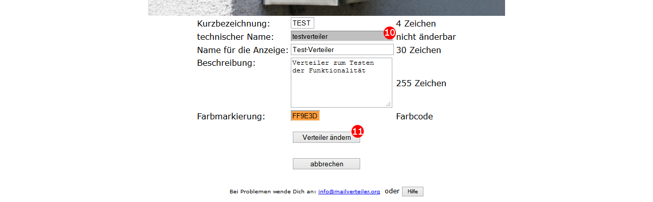 Wenn Du einen Verteiler änderst, sind bis auf den technischen Namen alle übrigen Informationen änderbar.